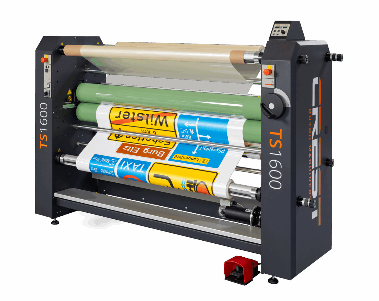 - Material range & capacity: 1,600 mm working width (max. width 1,650 mm), substrate thickness up to 130 mm, 3” cores, roll Ø up to 360 mm, roll weight up to 80 kg